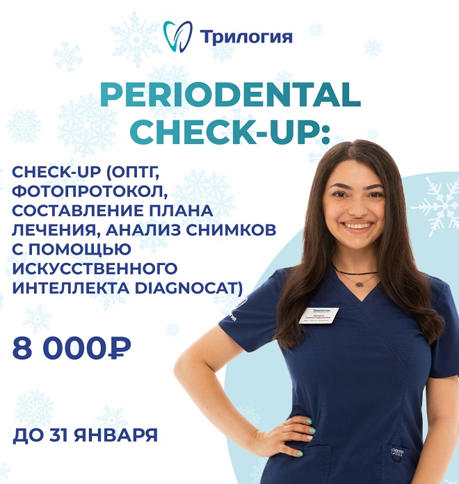 C 30 декабря 2025 — По 31 января 2026PerioDental Check-Up: комплексное обследование от ведущего пародонтолога + КТ, фотопротокол, составление плана лечения, анализ снимков с помощью искусственного интеллекта DiagnocatВоспользоватьсяПредлагаем пройти комплексное обследование PerioDental Check-Up у ведущего пародонтолога Трилогии за 8000₽.