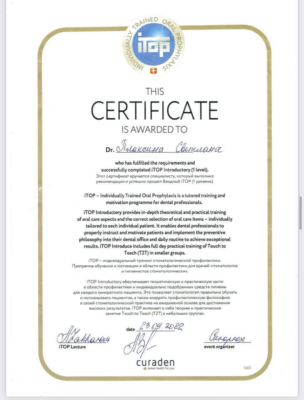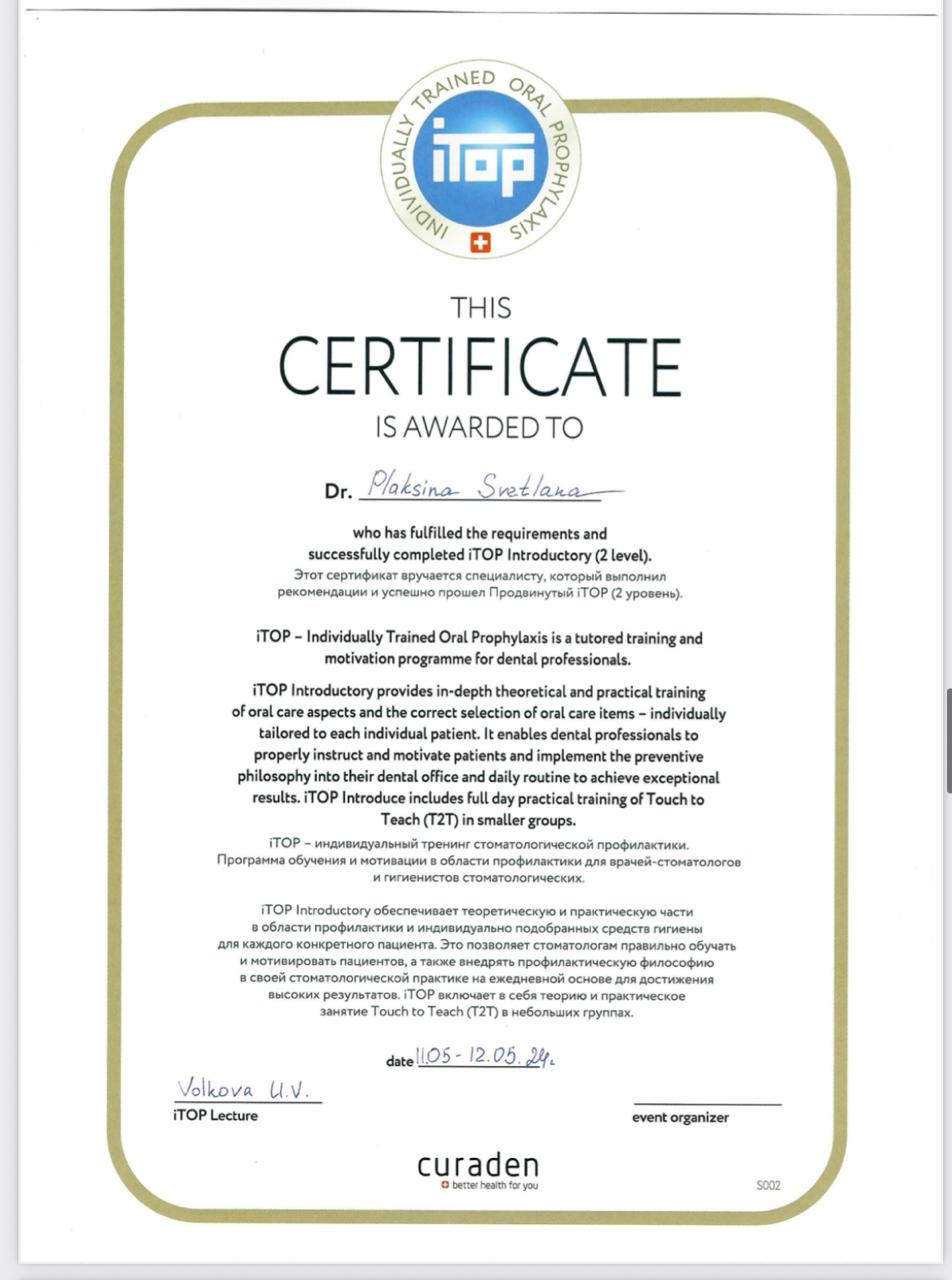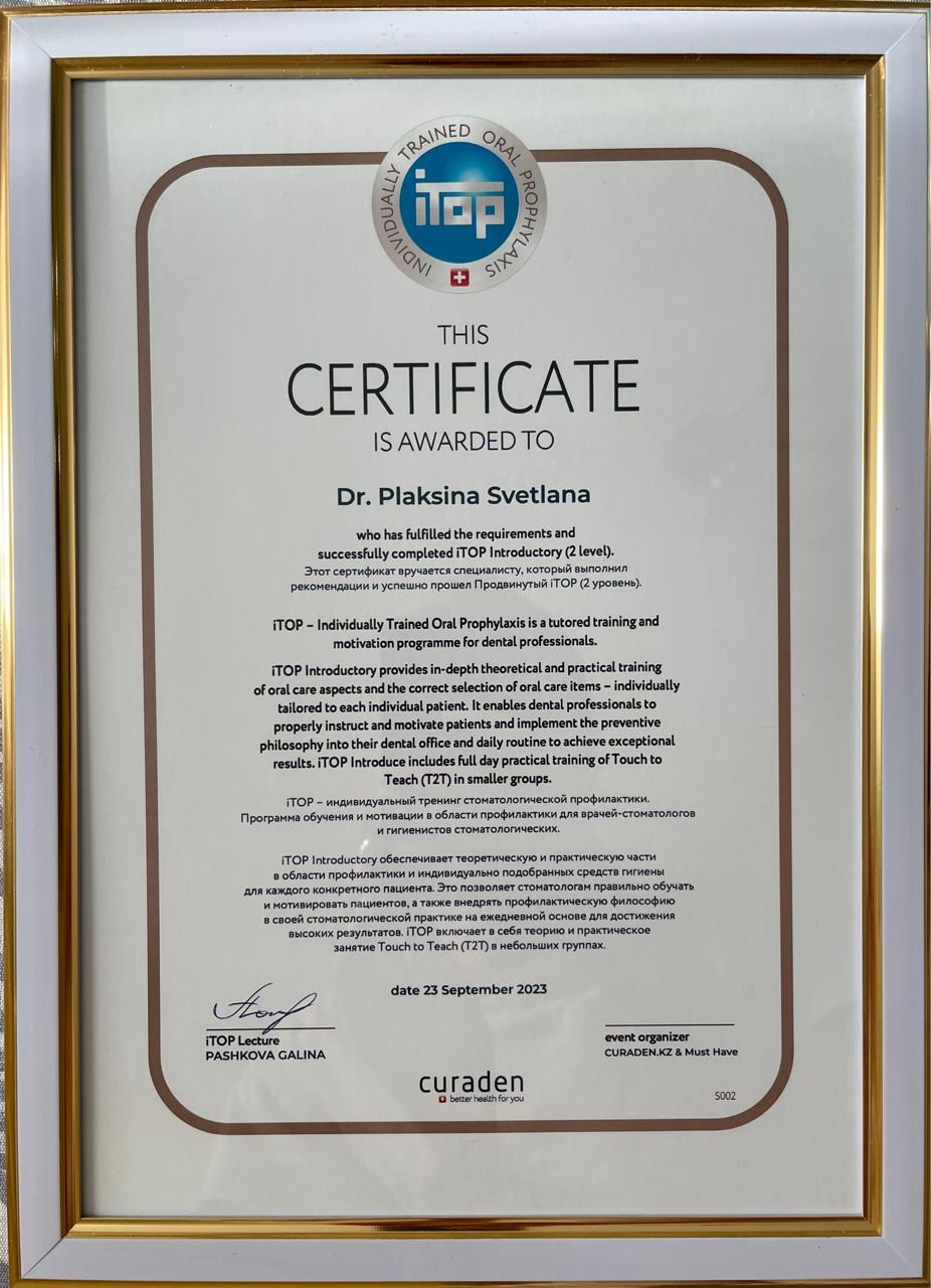 Особые навыки:• все виды профессиональной гигиены (Air-Flow, Vector, ультразвук, ручные инструменты); • лечение заболеваний десён (гингивит, пародонтит); • обучение индивидуальной гигиене прости рта iTOP.