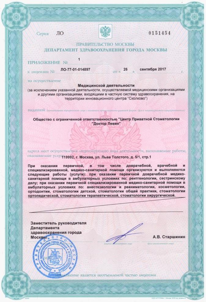 Стоматология «Доктор Левин» на проспекте Вернадского оснащена оборудованием последнего поколения. В частности, это немецкий компьютерный томограф Sirona Galileos, ультразвуковая хирургическая система NSK VarioSurg 3. Хирургические вмешательства проходят с применением новейшего микроскопа Seiler.